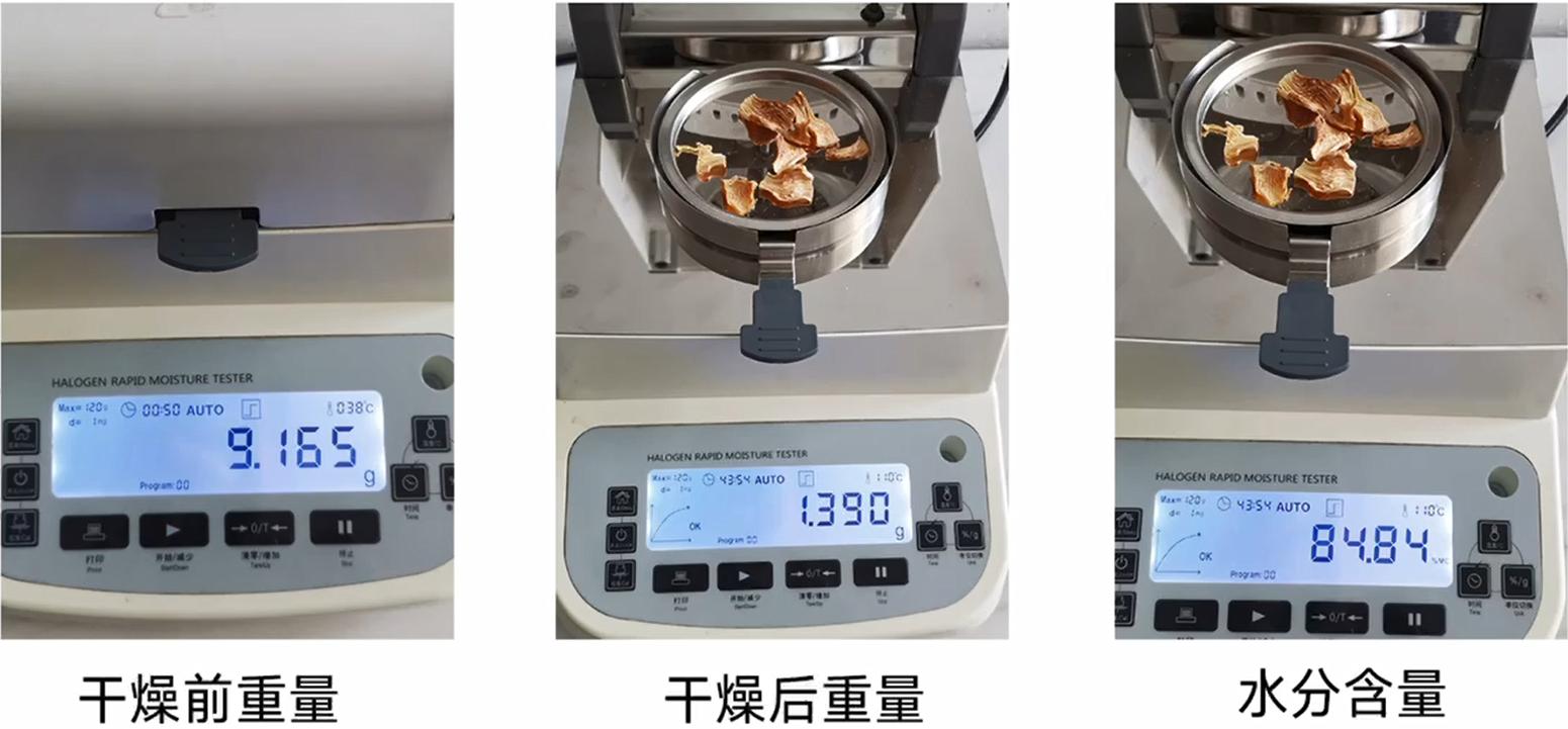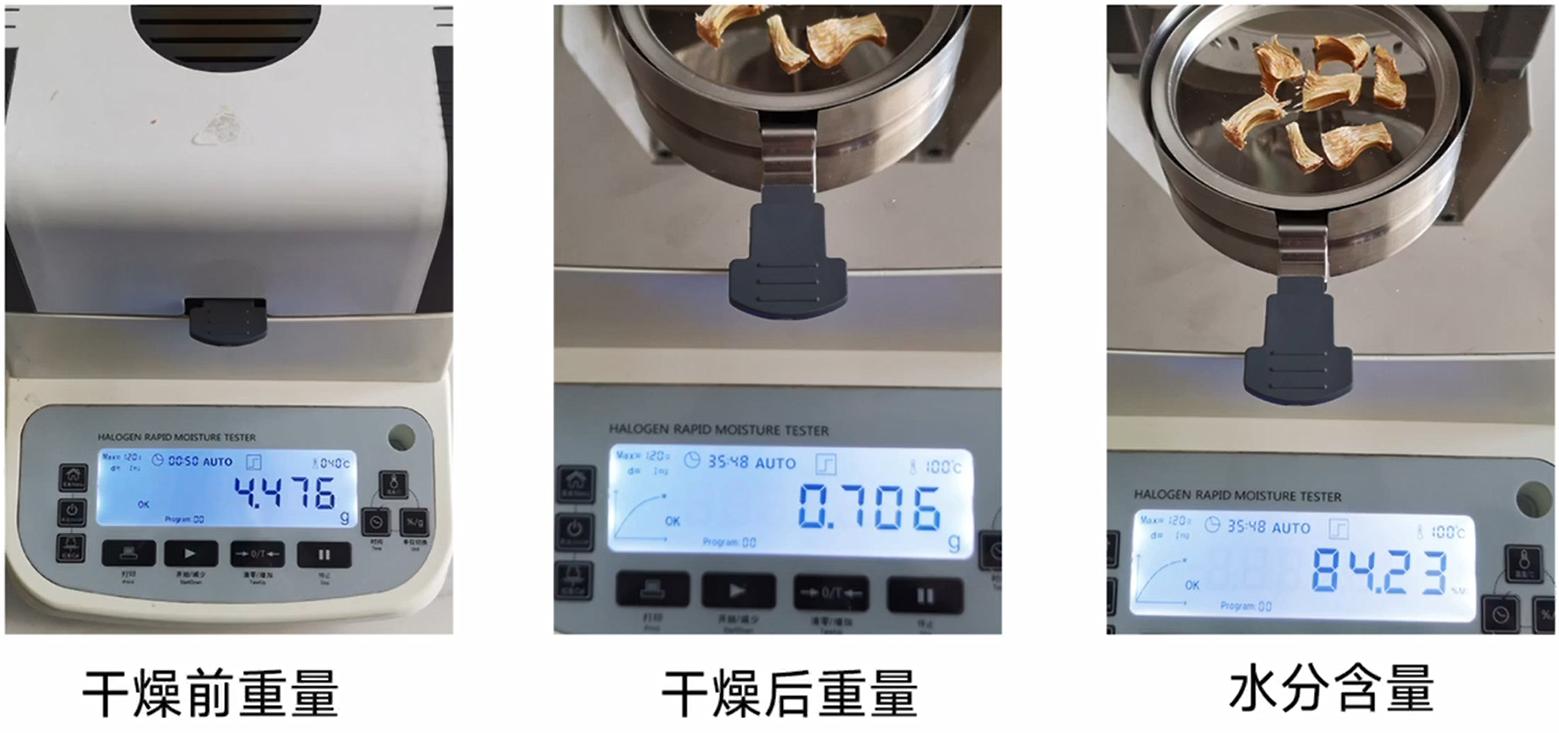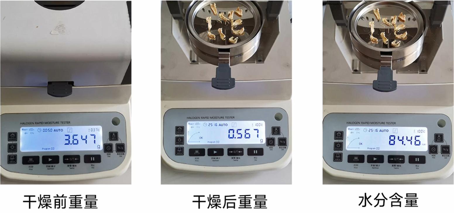 首先將測量溫度調(diào)整到100℃,然后將筍切成薄片,往樣品盤里加入3-5g的筍片,蓋上蓋子,等重量數(shù)值穩(wěn)定后按開始鍵,儀器開始自動測量。