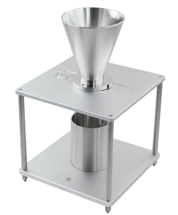 測(cè)定裝置原理:粉塵從漏斗口在一定高度自由落下充滿量杯;測(cè)定松裝狀態(tài)下量杯內(nèi)單位體積的質(zhì)量,即堆積密度。