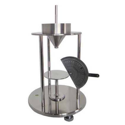 足夠滿(mǎn)溢料盤(pán)的粉塵從漏斗口注入到水平料盤(pán)上;測(cè)量粉塵堆積斜面與底部水平面所夾銳角,即粉塵安息角。